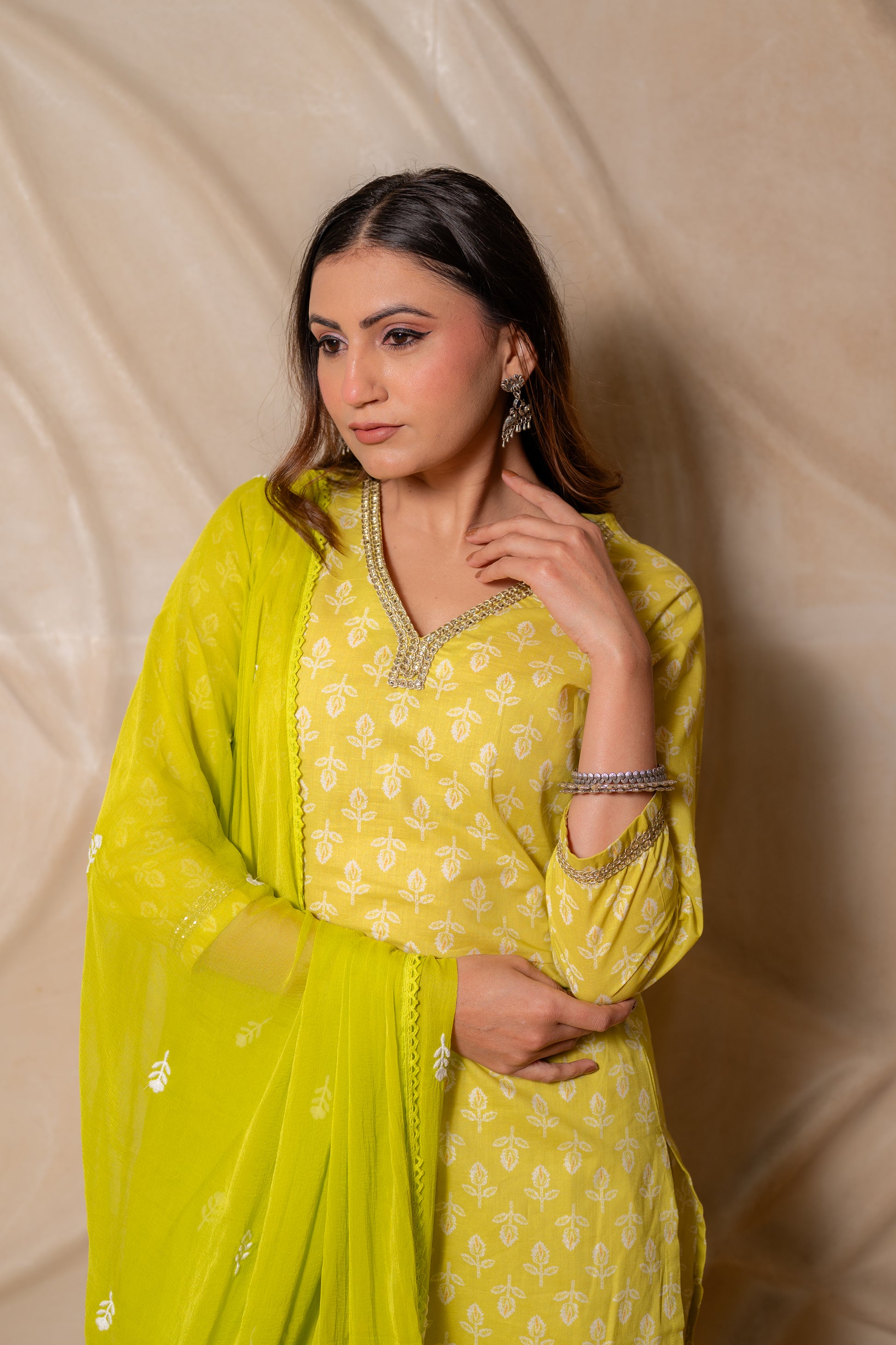 Perfect for haldi ceremonies, festive mornings, pujas, summer celebrations, and daytime gatherings, this set blends tradition with everyday elegance. Style it with juttis and silver jewellery for a fresh ethnic look.