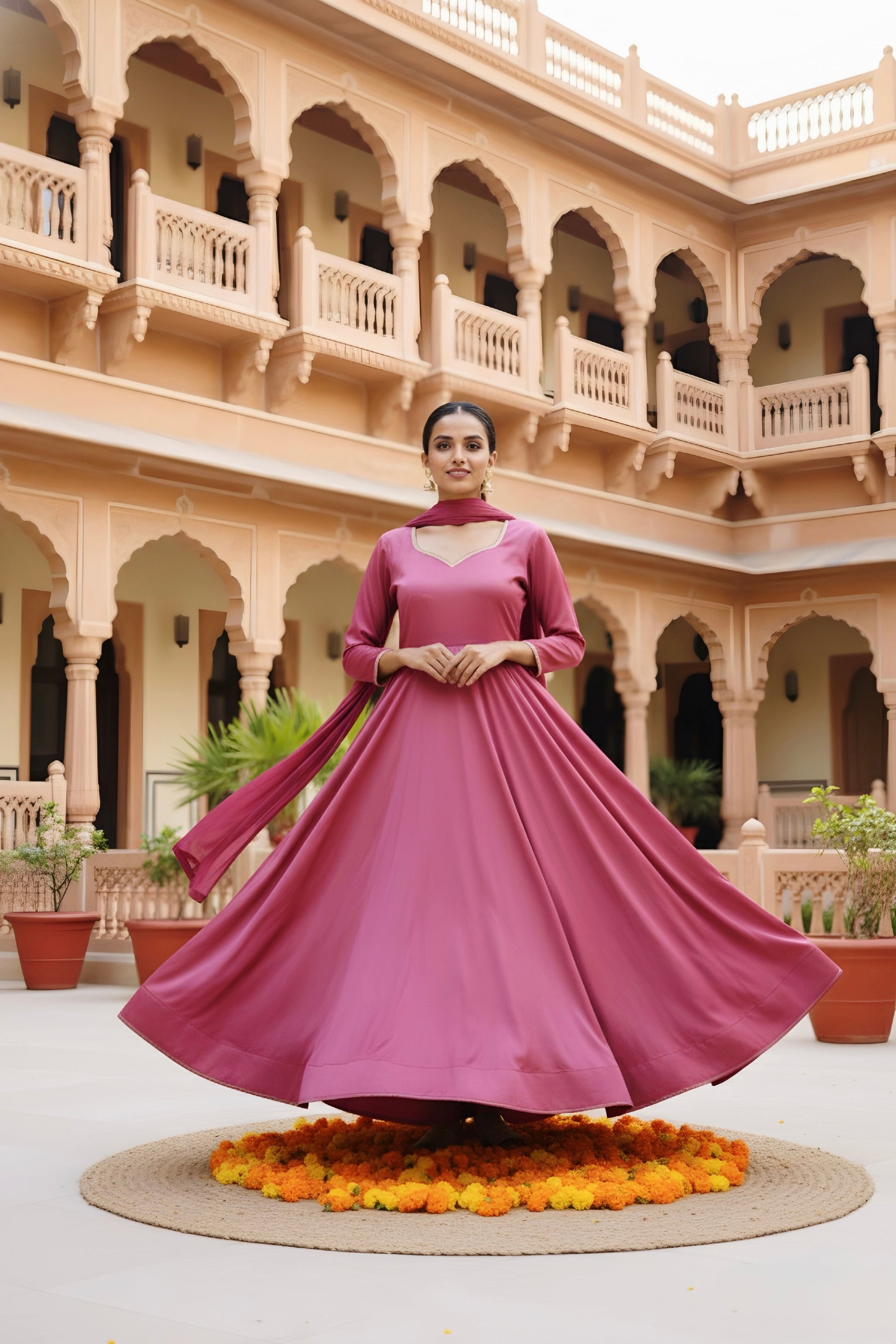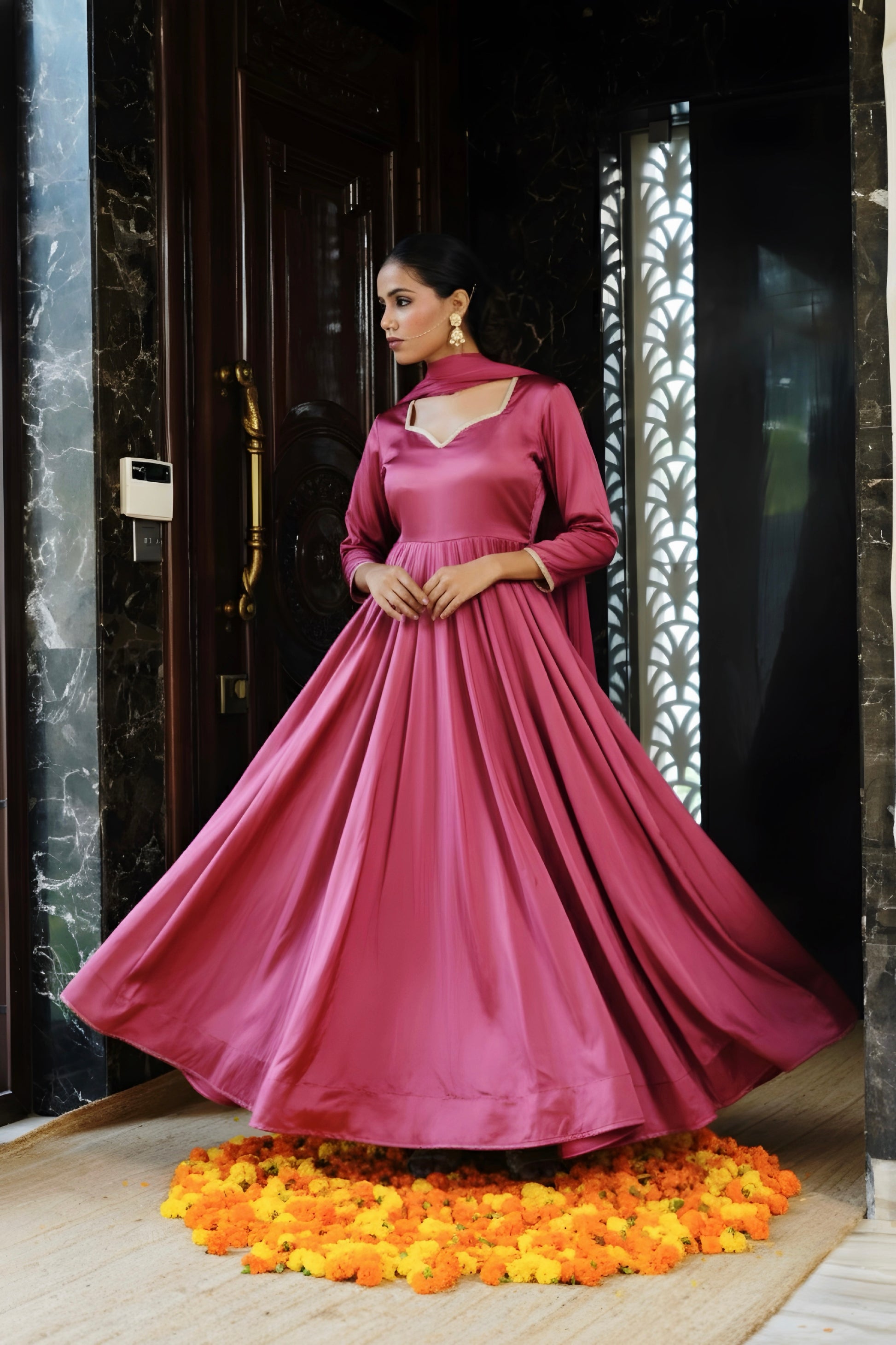 Paired with a matching chiffon dupatta, the outfit creates a perfect balance of simplicity and elegance. The solid tone and flowy structure make it ideal for both daytime festivities and evening celebrations — from mehendi functions to festive gatherings.