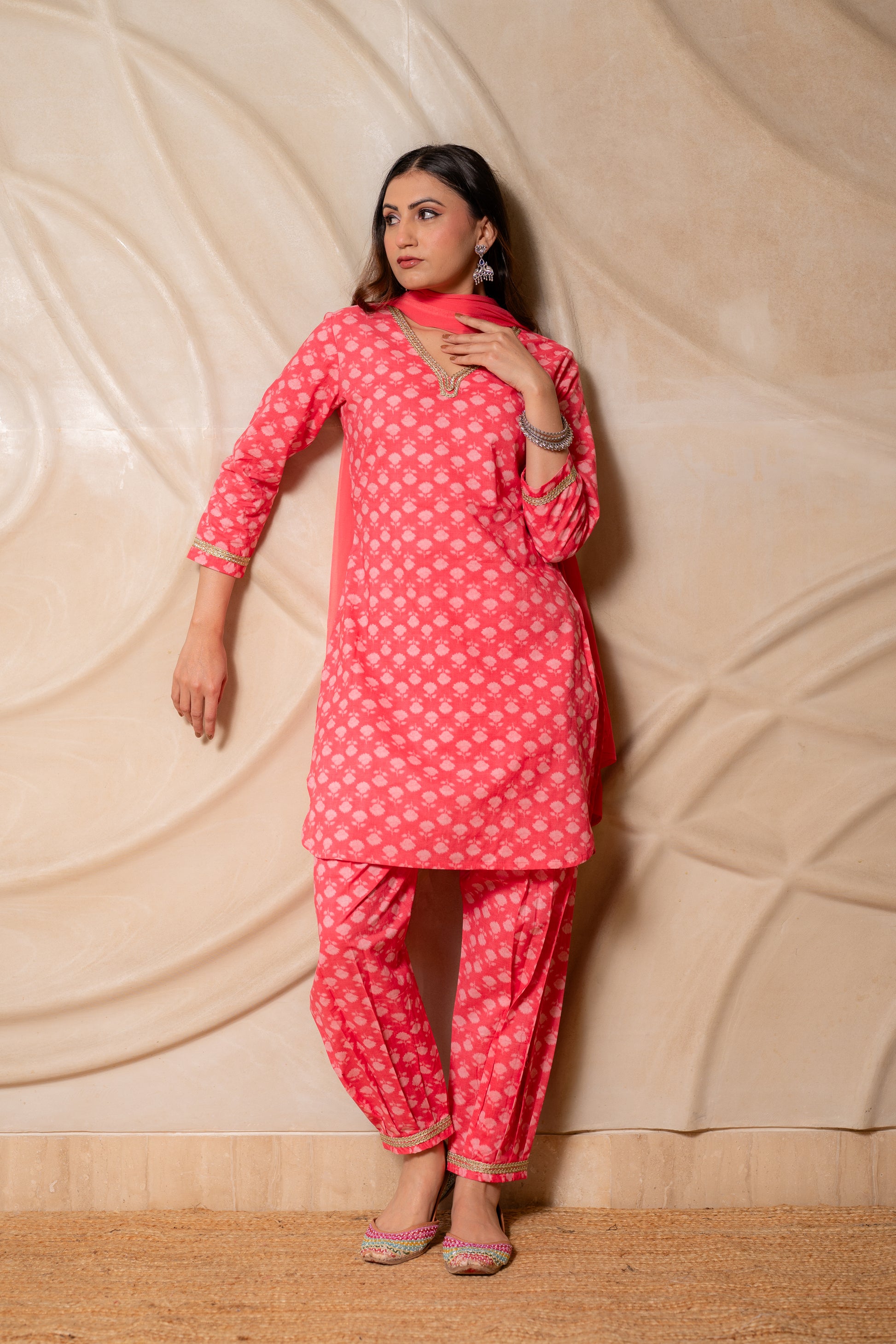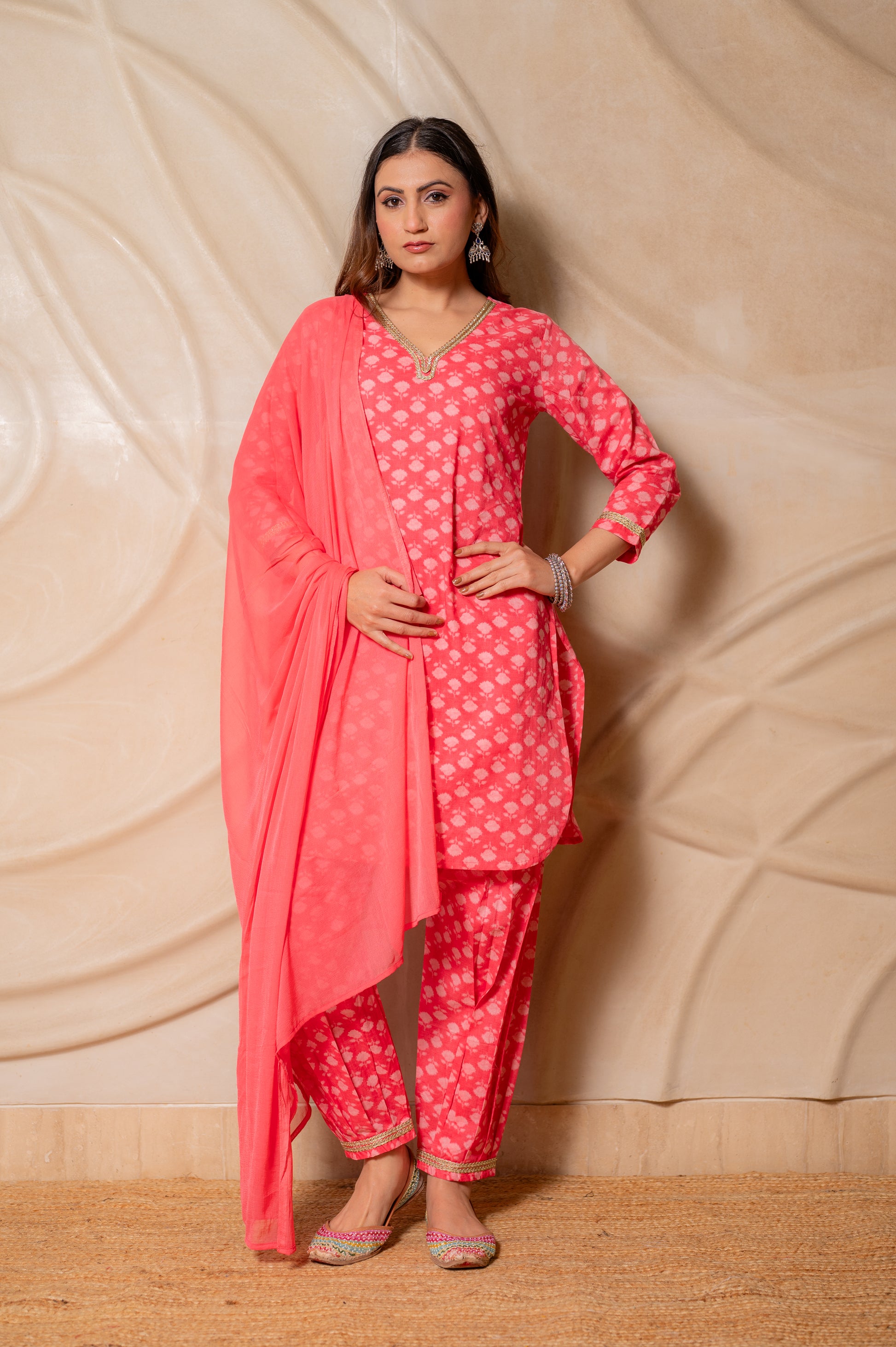 Step into effortless festive charm with our Gulabi Phool Suit Set, designed for women who love classic prints with a modern, graceful silhouette. Rendered in a beautiful coral-pink tone, this ensemble instantly adds warmth and elegance to your ethnic wardrobe.