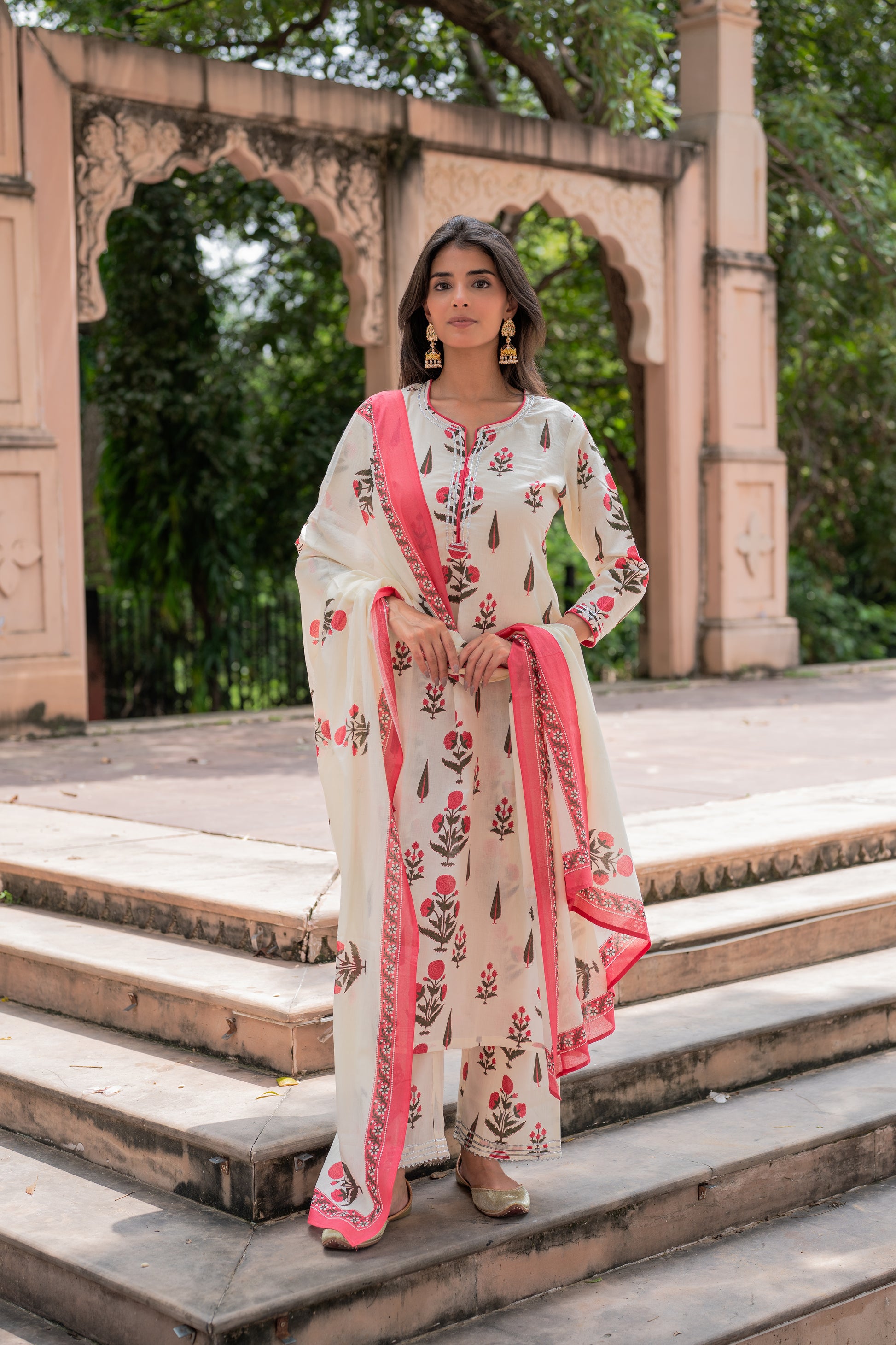 An elegant ivory kurta set adorned with delicate floral block prints in shades of pink and green, paired with a coordinated printed dupatta bordered in vibrant pink with subtle embroidery. The kurta features a straight silhouette with a classic round neckline and button detailing, making it versatile for both festive gatherings and daytime occasions.