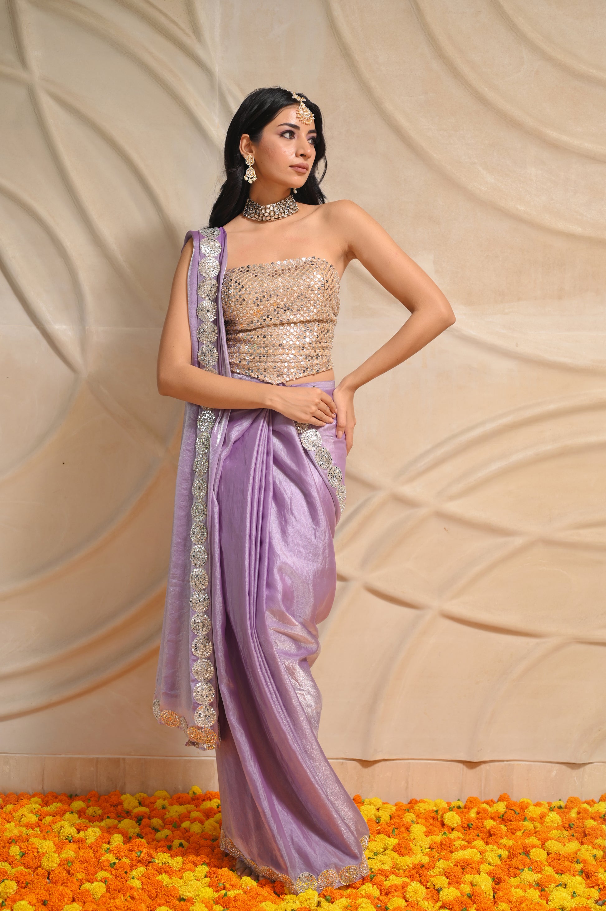 Ethereal and elegant, the Aabha Lilac Mirror Saree embodies sheer sophistication with a modern festive charm. Crafted in shimmer organza silk, this saree drapes beautifully, reflecting light with every movement. The soft lilac hue exudes calm femininity while the mirror-border adds a luxurious, handcrafted touch that’s perfect for celebratory evenings.