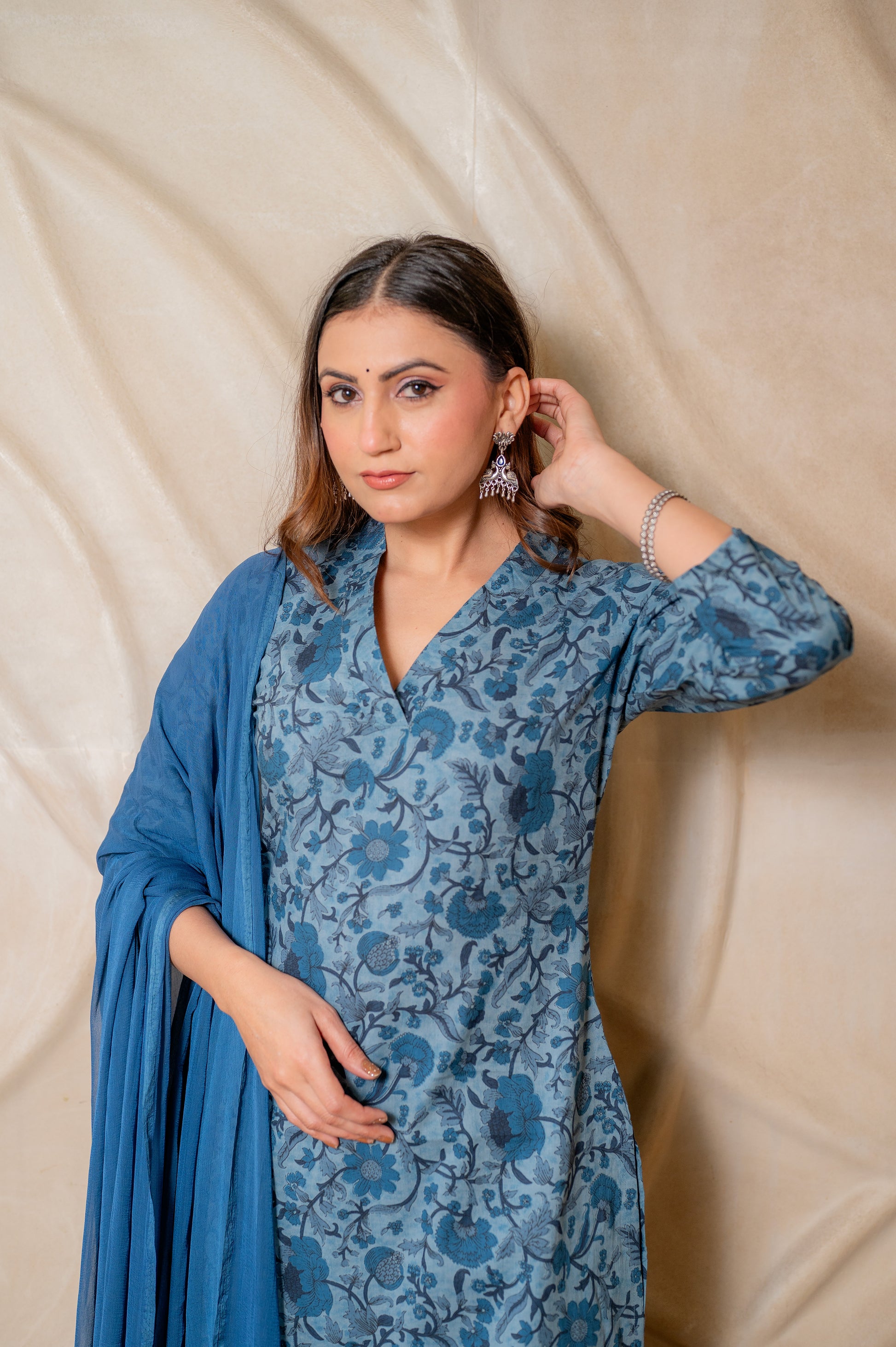 The kurta features a beautiful all-over floral print in tonal blues, creating a rich yet subtle look.
