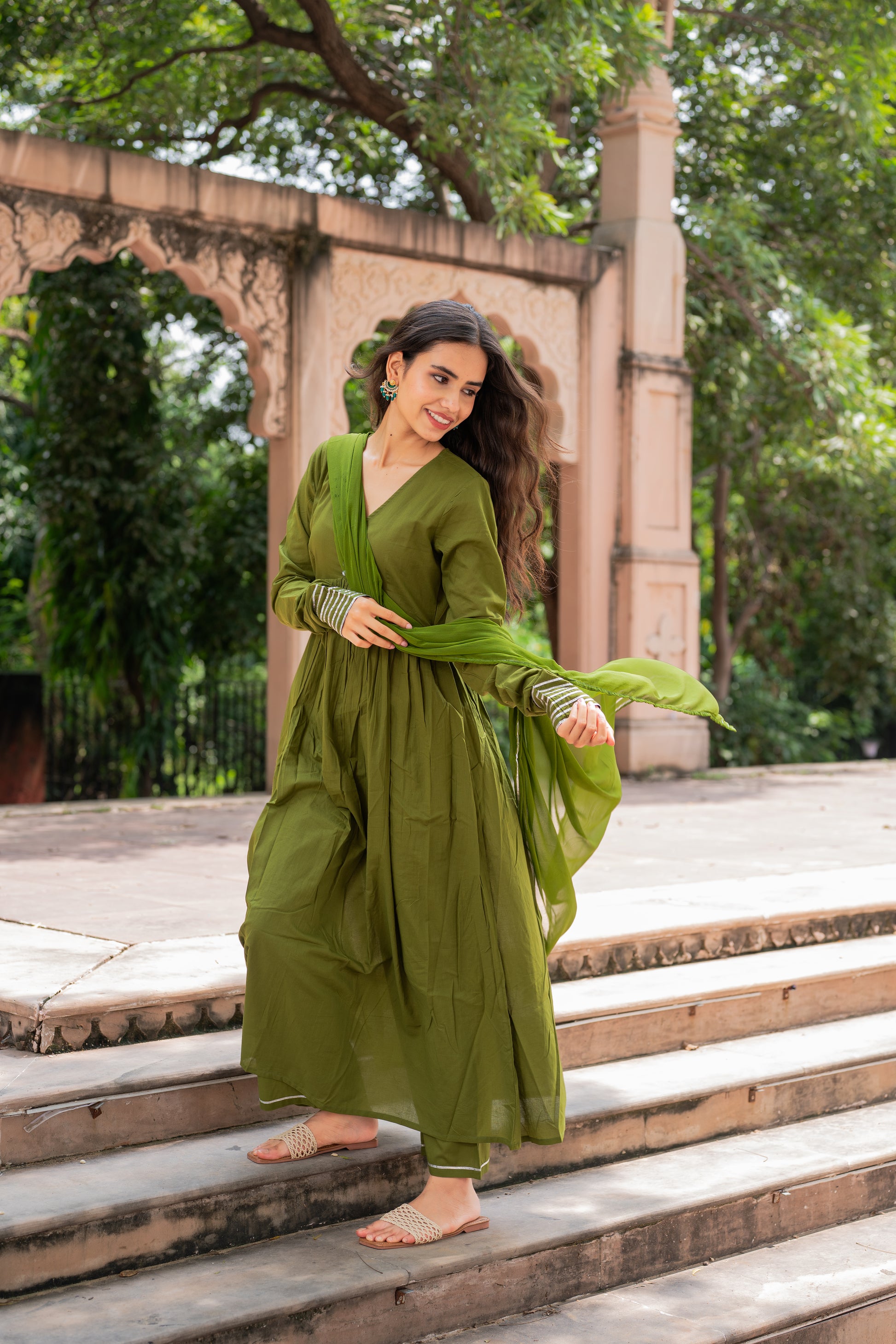 This olive green Anarkali suit set is a perfect mix of minimal elegance and timeless style. The Anarkali kurta features a deep V-neckline with delicate button detailing on the yoke, adding just the right touch of sophistication. Its flowy, gathered silhouette enhances grace and movement, making it both comfortable and effortlessly stylish.