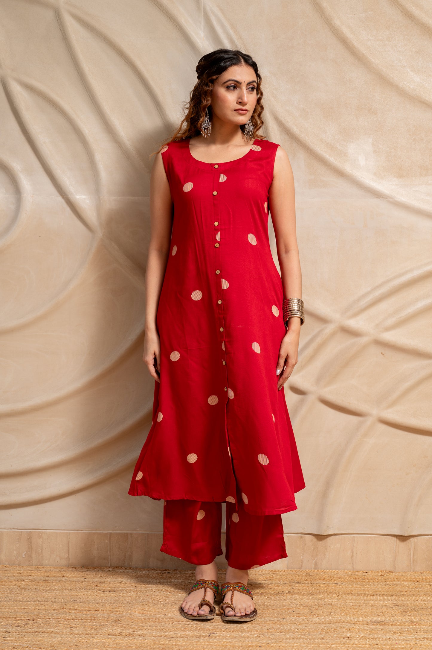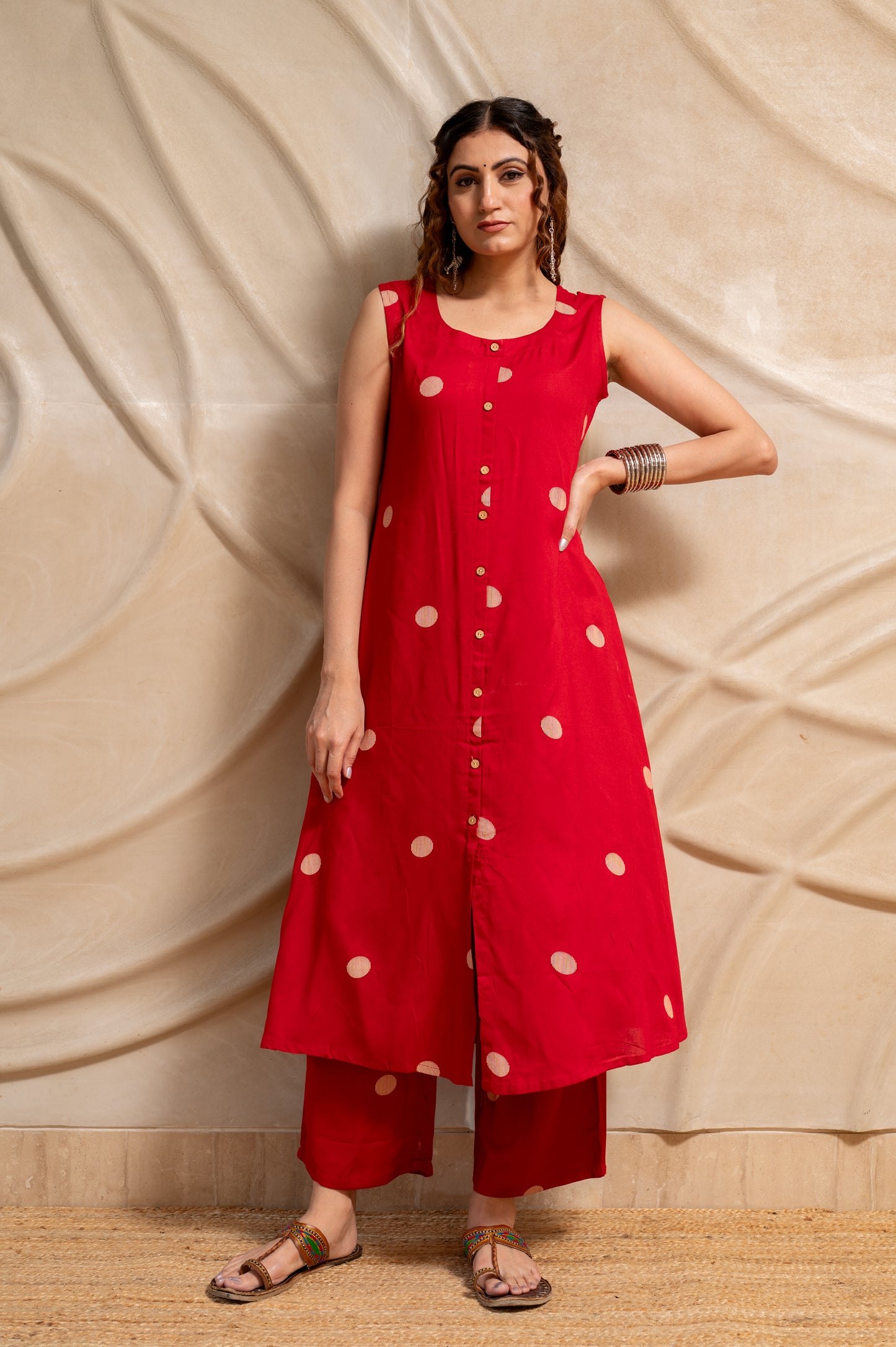 Elevate your style with the Rose Red coord set - set of 2. relaxed kurti Wide Pants, a perfect blend of comfort and craftsmanship. This relaxed-fit features embroidery which is exquisitely curated.The wide pants come with an elasticated waist at the back and inseam pockets for added convenience. Crafted from luxurious cotton slub fabric, this set ensures both elegance and ease, making it a versatile addition to your wardrobe for any occasion.