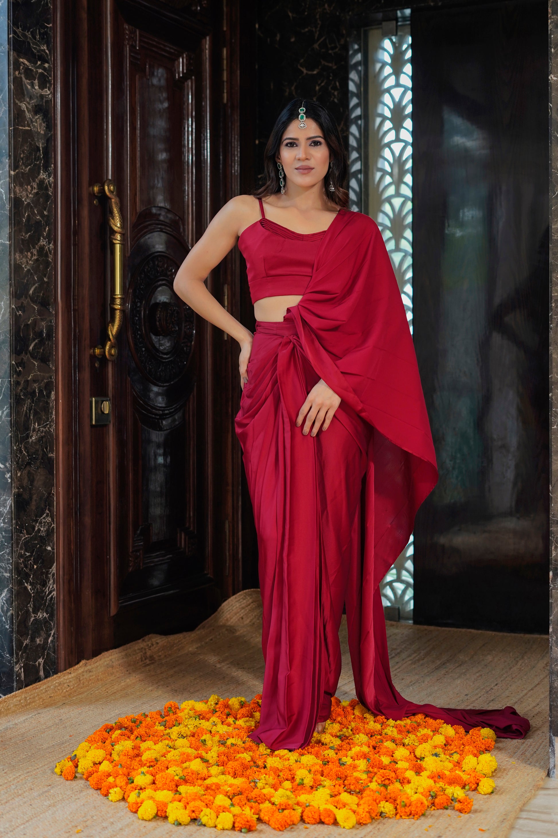 Modern minimalism meets timeless tradition in our pre-draped saree designed for effortless sophistication. Crafted from luxurious silk, the saree features an intricately structured drape silhouette that flatters every curve, creating fluid movement with every step. Blouse with a contemporary neckline adds definition, while the side-knot detailing lends a sculpted, graceful touch.