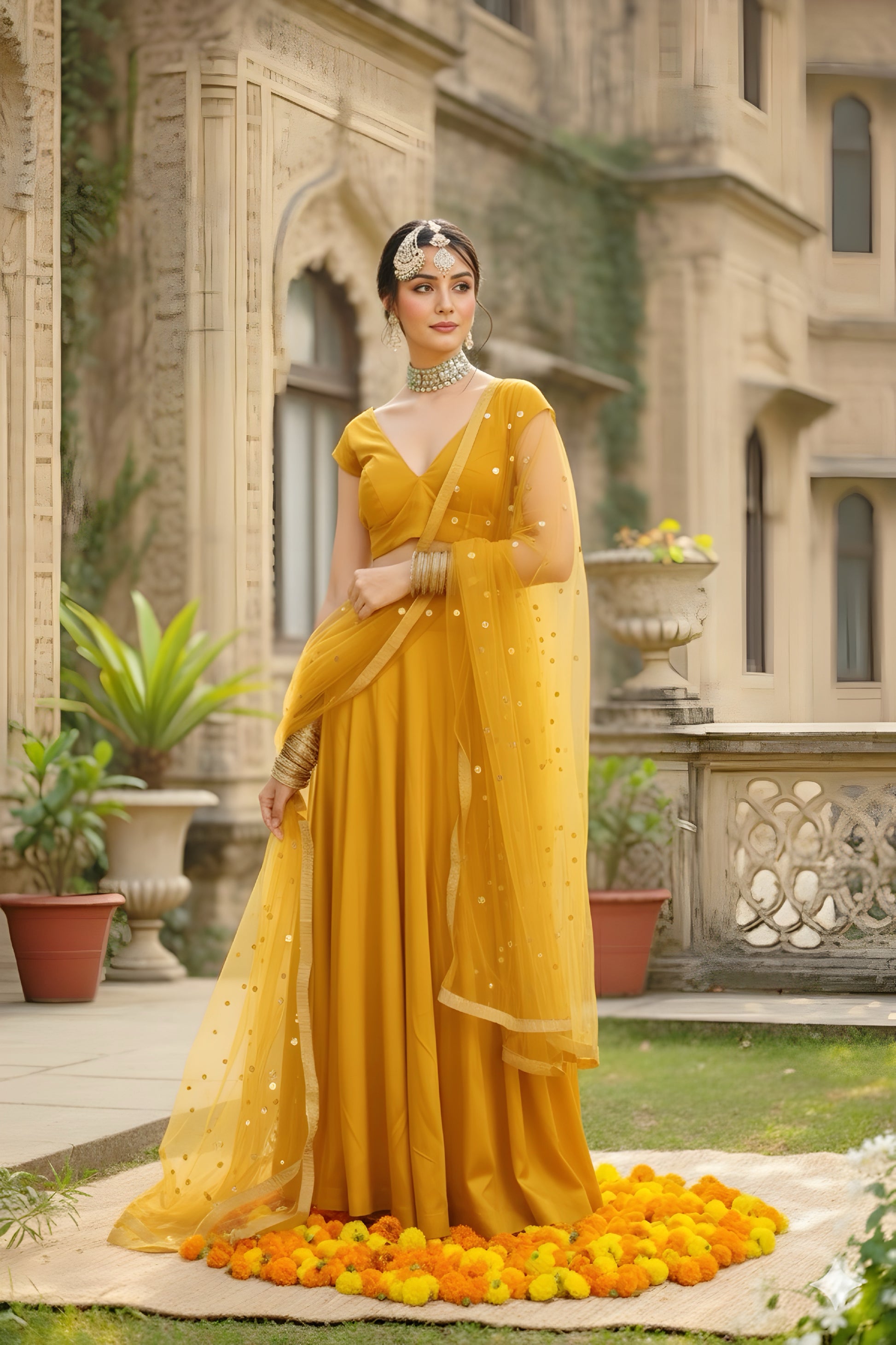 The blouse features a deep-V neckline with structured tailoring that flatters the frame, while the flowing silk skirt drapes beautifully to create a regal yet effortless silhouette. Completing the look is a delicate net dupatta, gracefully embellished with scattered mirror-sequin detailing and finished with a soft gold border — adding just the right hint of festive shimmer.